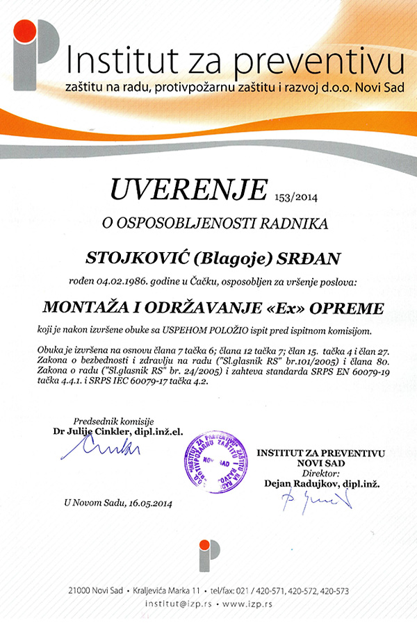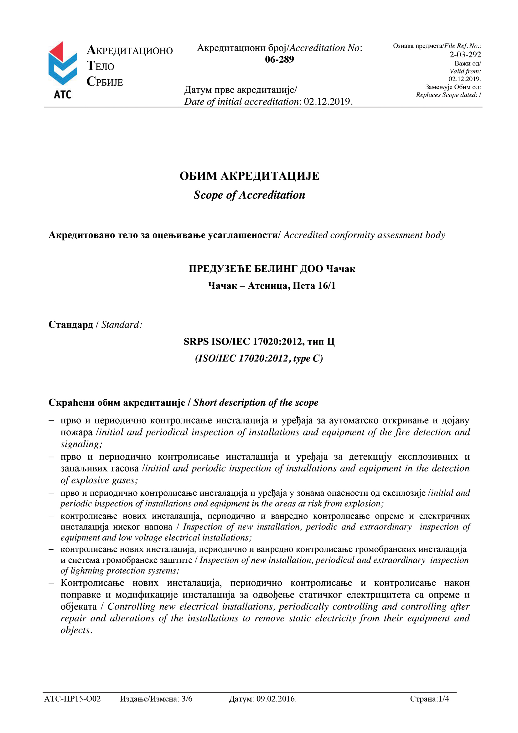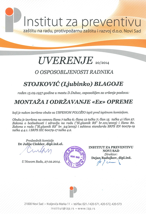 Preduzeće BELING d.o.o. vrši redovan periodični pregled i remont električnih uređaja predviđenih za rad u eksplozivnim atmosferama (Ex uređaja) od strane stručnih lica, shodno članu 8. stav 1. i članu 32. stav 1. tačka 1. Zakona o eksplozivnim materijama, zapaljivim tečnostima i gasovima (“Sl. Glasnik SRS”, broj 44/77 i “Sl. Glasnik RS”, broj 48/94) i shodno odredbama SRPS EN 60079-17 i SRPS EN 60079-19.