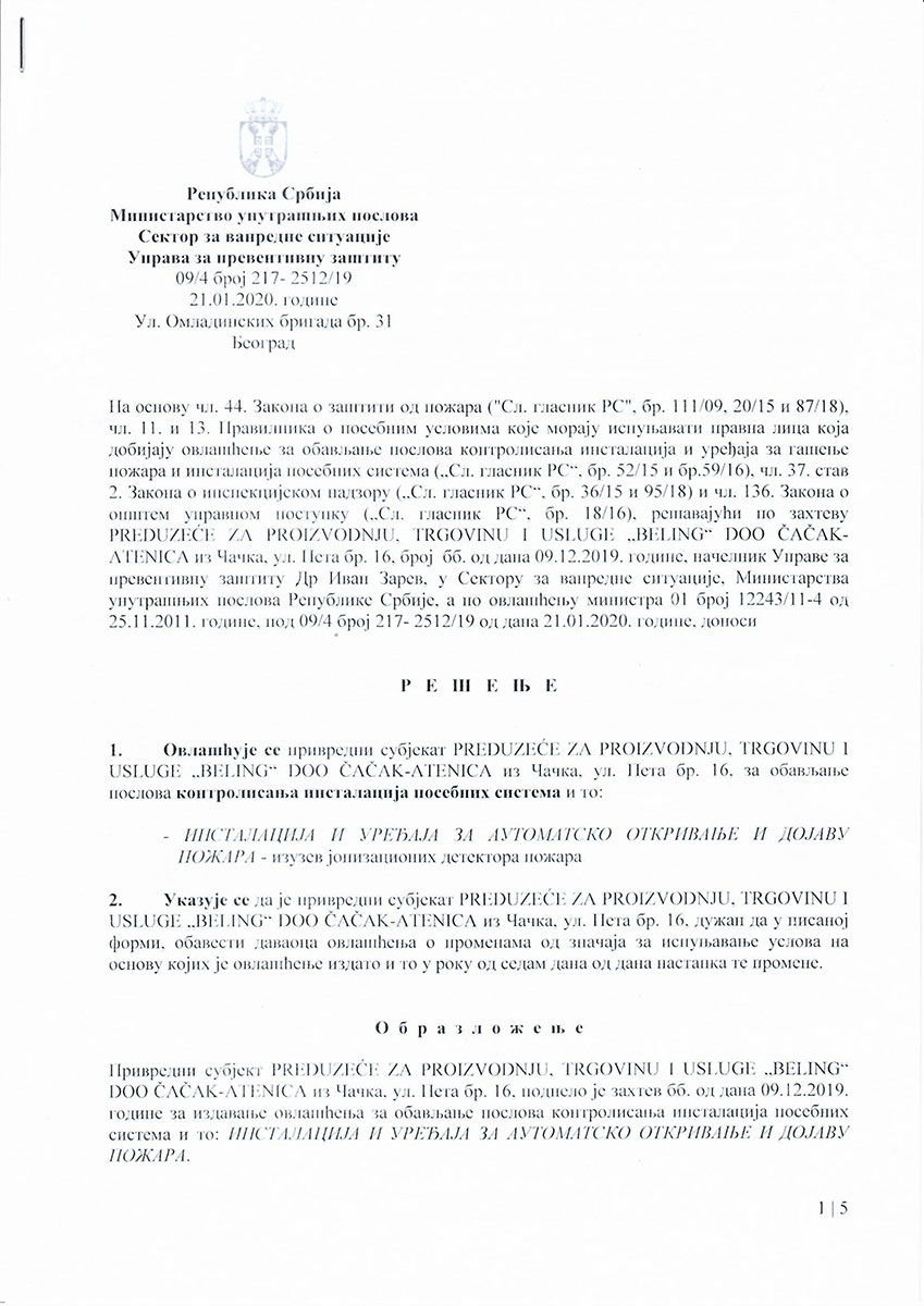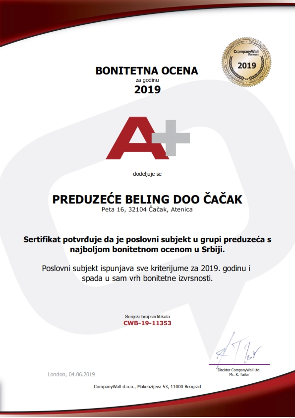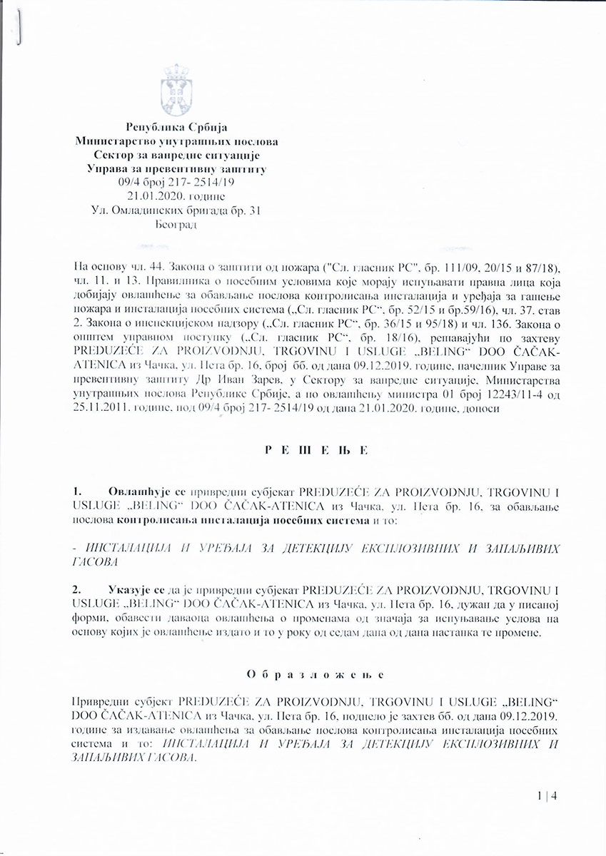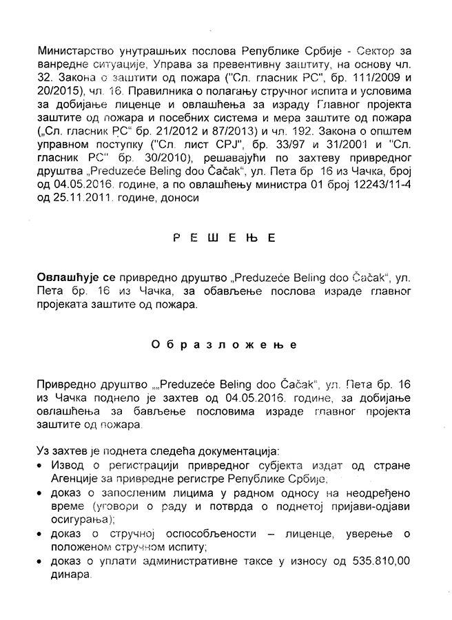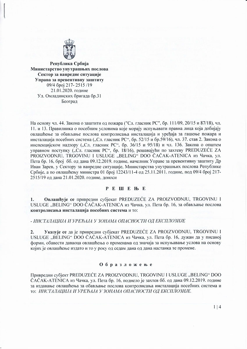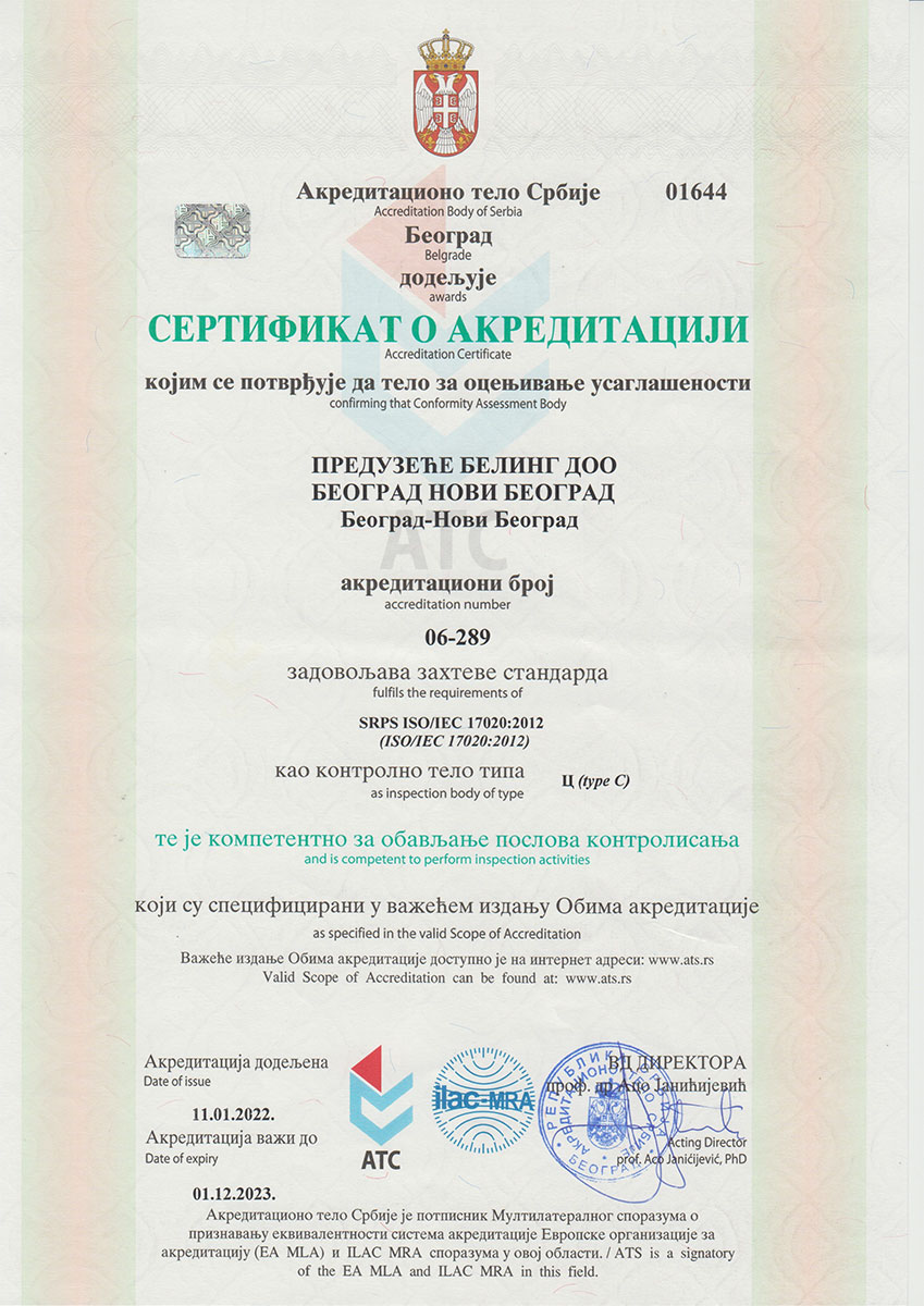 Beling d.o.o. izdaje stručne nalaze i ateste, (rešenje o registraciji), koji se koriste kod: